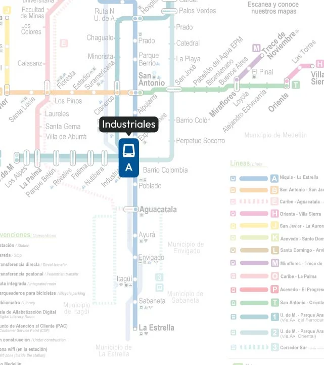 La Estación Industriales toma su nombre del sector donde se ubica: una de las zonas más representativas del desarrollo económico y manufacturero de Medellín. Tradicionalmente, este sector fue el corazón industrial de la ciudad, albergando fábricas, empresas textiles y metalmecánicas que impulsaron la economía antioqueña durante gran parte del siglo XX.