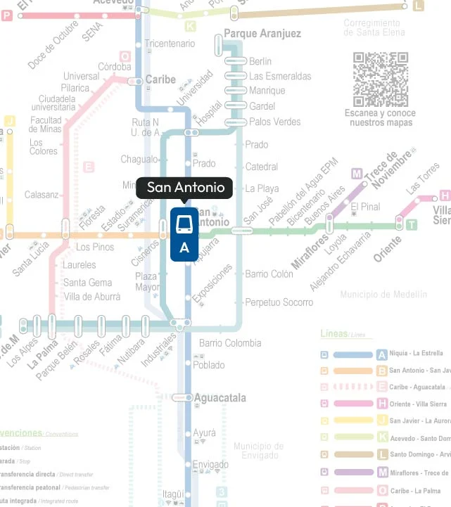 Diseñada por el arquitecto argentino Clorindo Testa, la estación destaca por su arquitectura moderna y funcional, adaptada para facilitar el acceso a personas con movilidad reducida . Gracias a su ubicación estratégica y a la integración de múltiples líneas, la Estación San Antonio es un punto neurálgico para la movilidad en Medellín y un referente del desarrollo urbano de la ciudad.