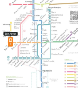 Su infraestructura destaca por su diseño elevado, con amplios espacios y vistas panorámicas del occidente de Medellín. San Javier es mucho más que una estación: es un símbolo de transformación urbana y social, especialmente relevante por su cercanía a la Comuna 13, reconocida mundialmente por su vibrante arte urbano, sus coloridos grafitis y su historia de resiliencia.
