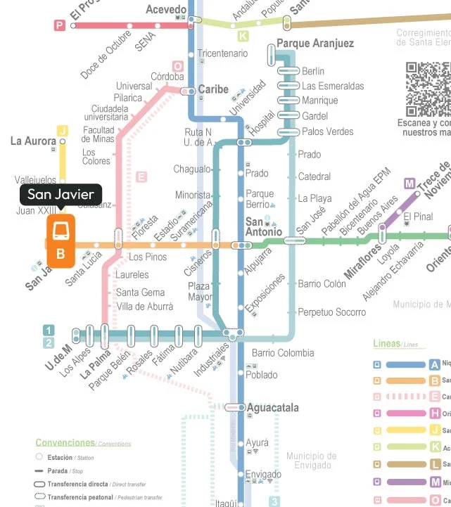 La estación San Javier es la terminal occidental de la Línea B del Metro de Medellín, ubicada en la comuna 13 (San Javier), una de las zonas más representativas de la ciudad. Inaugurada en 1996, esta estación sirve como un importante punto de conexión no solo para la Línea B, sino también para el Metrocable Línea J, que asciende hacia barrios de ladera.